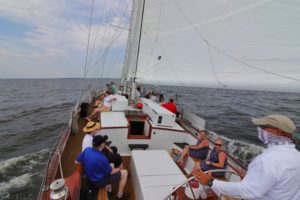 Crew members wear face coverings for the entire sail, but guests have more flexibility. Masks are required for boarding, but once they depart and the sails are up, the captain invites those who wish to can take their masks off. “It’s whatever your comfort level is,” says Jen.