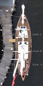 It was the tape measure that dictated the rest, she says. The boats usually hold 49 guests but now sail with 24 max. Groups are seated in zones that accommodate different group sizes: two people on each side of the cockpit (A and D), six people seated together port and starboard in the center of the boat (B and F), and two groups of four up front (C and E).
